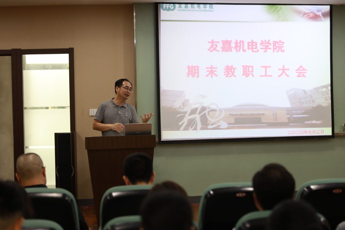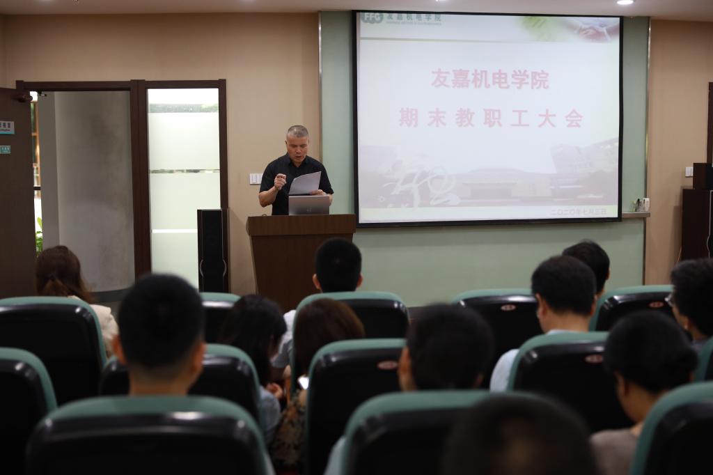 7月3日上午,友嘉机电学院在分院简报室召开期末全体教职工大会,党总支副书记、副院长周佳良主持会议,院长裘旭东作主题发言。