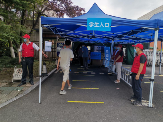 为保障学生在进出校园门岗时,间隔一米,有序排队,进行刷卡测温。第五党支部党员教师在学校东大门分时间段进行轮班值守。值守的主要内容是提醒同学们“排成纵队、间隔一米、戴好口罩、持通行证”有序进校,并处理学生突发情况。学生返校复学以来,天气或夏日炎炎、或雷雨阵阵,但是当听到同学们亲切的“老师早上好”,“老师中午好”,看到他们自觉排队,健康自信的步入校园的时候,志愿者们感到无比自豪。