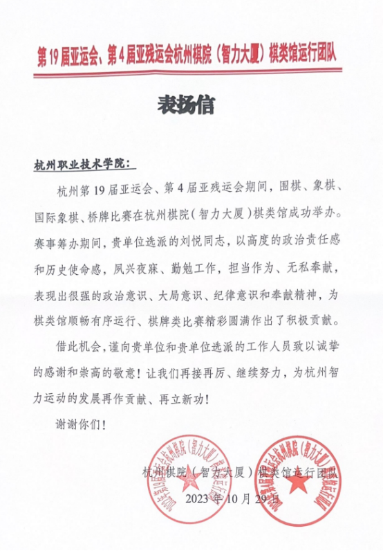 随着杭州第十九届亚运会和第四届亚残运会的圆满落幕,杭州向世界呈现了一场“中国特色、亚洲风采、精彩纷呈”的体育盛会,展示了中国的热情与专业。近日,杭州棋院(智力大厦)棋类馆发来表扬信,表扬我校友嘉智能制造学院教师刘悦在亚(残)运会期间的出色表现。