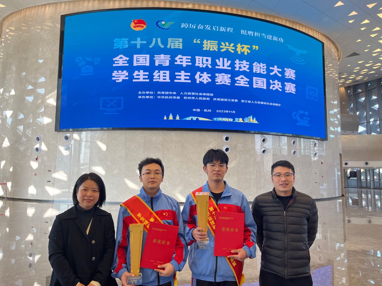 友嘉学院数控技术竞赛团队自今年上半年开始备赛工作以来,放弃节假日,厉兵秣马,全力以赴;学校各部门为参赛选手提供了全方位的支持与保障。竞赛指导教师团队踏实肯干,学生选手努力拼搏,通过杭州市赛、浙江省赛的层层选拔,最终站上了国家级竞技舞台,并抓住机会,不负众望,2位选手都获得最高奖项。