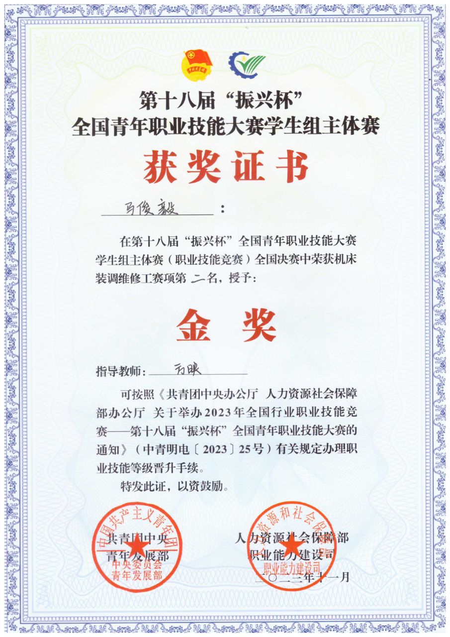 近日,由共青团中央、人力资源社会保障部共同主办的第十八届“振兴杯”全国青年职业技能大赛学生组主体赛全国决赛获奖名单公布,我校友嘉智能制造学院数控技术专业学生马俊毅、葛赛锋在方映、钱仁寅两位老师的指导下,凭借过硬的技术和稳定的心态,双双获得“机床装调维修工”赛项金奖,取得我校在该赛项上的历史性突破。