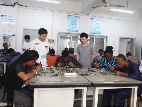 友嘉智能制造学院安排了理实结合的课程,留学生们不仅学习了电工电子理论知识,也进行了接线、焊接等实践训练。留学生们感受到了中国职业教育的新面貌,明晰了他们专业选择方向。老师们在课程中加入中国文化元素,让留学生们认识到中华文化的魅力,他们深深地被丰富多彩的中华文化所吸引。同时,学院安排了部分中国学生作为助教,和留学生们建立了友谊的桥梁,在课程中教学相长。