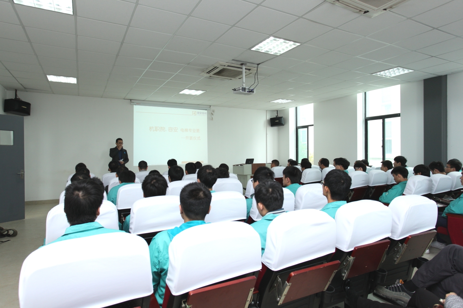 11月19日下午,杭州容安特种设备职业技能培训有限公司与我校合作开办的“杭职院·容安电梯专业班”在友嘉机电学院正式开班,在钢结构二楼专业班内举行了开班仪式。杭州市特种设备检测研究院副院长李伟忠、电梯检验所责任工程师金新锋、杭州容安特种设备职业技能培训有限公司总经理沈健康、副总经理韩霁、杭州各知名电梯公司负责人、友嘉机电学院院长陈加明、书记邵立东、副院长潘建峰及机电专业所有教师、电梯专业班28名学生参加了仪式。
