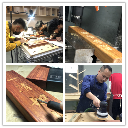 友嘉机电学院党总支高度重视党风廉政建设工作,积极探索廉政文化建设新途径,以镇纸为载体,大胆创设廉政文化建设的有效途径。分院党总支动员工设、模具、数控三个专业的骨干教师与优秀学生组成团队,历时一个半月圆满达成目标。组员们精心挑选17种木料切割成预定尺寸,两端封蜡存放30天,确保木材中的水分缓慢挥发,使木性得以稳定;模具、工设专业的同学手工清除蜡油后,再以刨、磨的方式修正存放期间产生的弯曲变形,并逐步打磨至400目;工业设计专业的同学设计了数十个图样,针对木料的材质特性不断调整字体、图样,几易其稿;数控专业的师生先尝试了激光雕刻,成品效果不佳,后又改为数控铣床加工,摸索数天后终于总结出不同木材的加工速率与走刀轨迹;加工完成后用雕刻刀手工清底,修整细节,并精心打磨以获得细腻的手感。