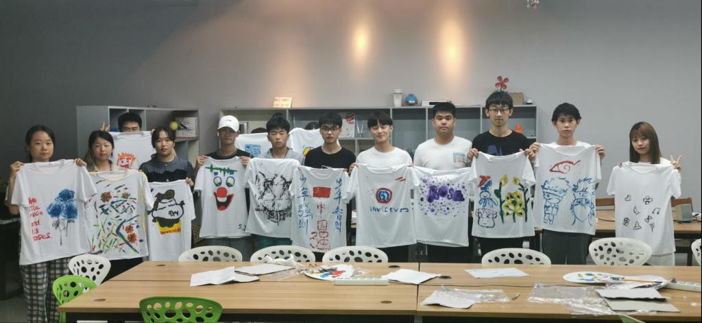 活动开始,同学们立刻投入到构思、打稿中,几分钟后,原本白色的T恤衫上便呈现出各种各样颇具创意的底稿。颜料在T恤衫上泼洒、画笔在空中挥舞,一件件白T在同学的奇思妙想下变得生动有趣。同学们用自己的双手与灵感DIY出只属于自己的个性T恤,在短短的时间内勾勒出自己的心中所想,每个图案,每个文字,都源自内心,始于创意。