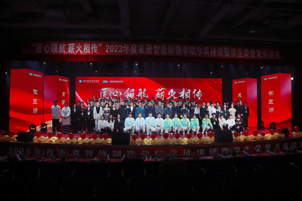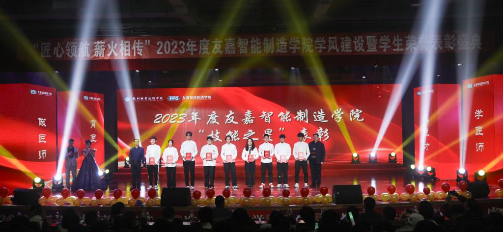 此次表彰盛典共分为“匠心筑梦 笃行致远”、“砥砺奋进 不负韶华”、“同心同航 共向未来”三个篇章,分别表彰了2023年度友嘉智能制造学院“匠心学子”榜样人物、国家级技能竞赛获奖者、国家奖学金获得者、省政府奖学金获得者以及杭州第19届亚运会、第4届亚残运会全体服务人员。