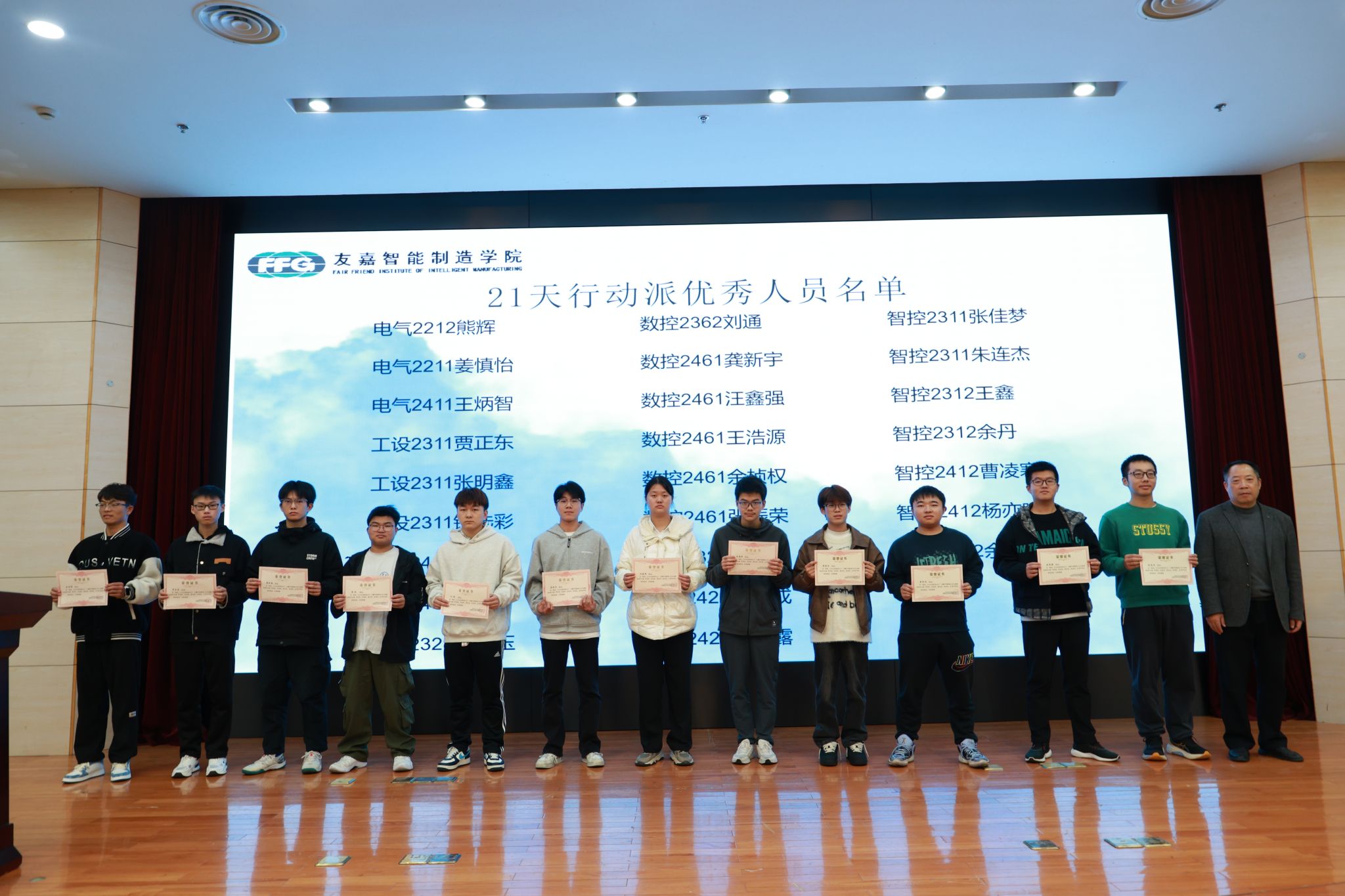 大会随后进入颁奖典礼环节。在朗读、书法、文学创作及21天行动派等活动中,多位同学凭借出色的表现荣获奖项。其中,数控2461班的汪鑫强在朗读和文学创作比赛中均获得佳绩,展现了其全面的才华;智控2312班的马思敏则以精湛的书法技艺荣获书法比赛一等奖。这些获奖同学不仅为学院赢得了荣誉,也为同学们树立了学习的榜样。此外,21天行动派优秀学生代表张振荣在颁奖活动后也发表了感言。他分享了自己参与“21天行动派”挑战的心得体会,强调了坚持与努力的重要性,并鼓励在场的同学们要勇敢面对挑战,坚持不懈地追求自己的梦想。