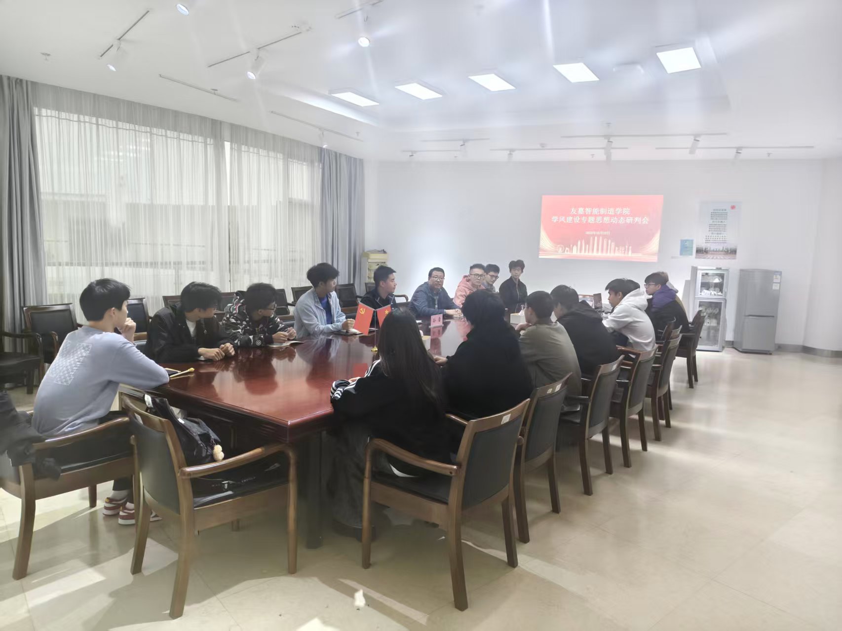 为精准了解学生在教学环节的意见与建议,搭建师生教学沟通桥梁,切实找准教学质量提升的发力点,进一步优化教学服务、夯实人才培养基础,10月22日下午,友嘉智能制造学院在友嘉圆盘E310会议室召开新学期学风建设思想动态研判会。学院副院长韩天龙、电气中外合作项目负责老师孙雷、学风建设辅导员石鹏程及电气中外合作班级各班代表参会,会议聚焦电气专业“教学质量提升”核心议题有序推进。