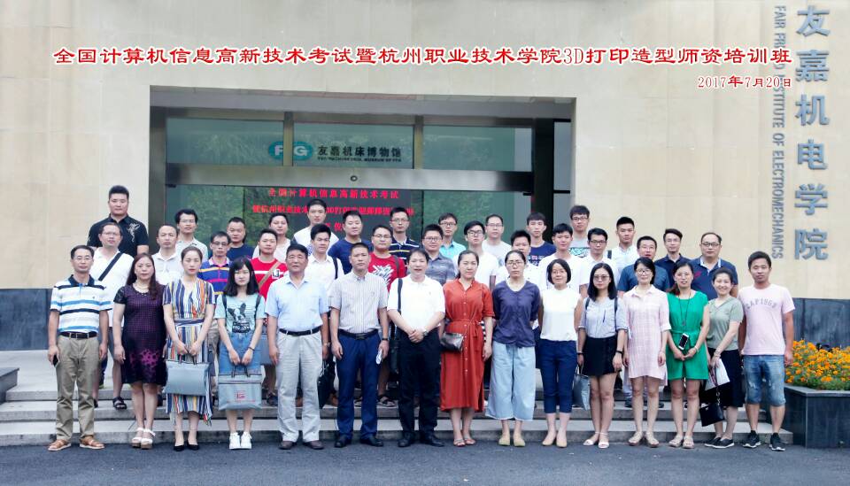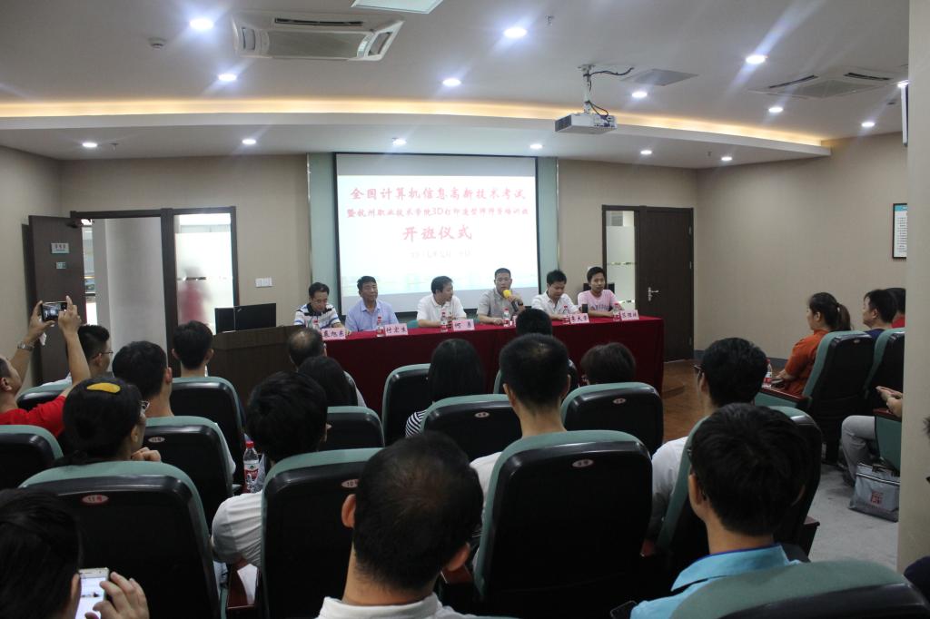7月20日上午,由我校承办的“3D打印造型师师资认证培训班”在友嘉机电学院二楼简报室举行了开班仪式。杭州职业技术学院副校长陈加明、北京企学研教育科技研究院执行院长何勇、清华大学基础工业训练中心客座教授付宏生、北京三维天下科技股份有限公司首席设计师李大荣以及来自全国各地近50名学员出席开班仪式.友嘉机电学院院长裘旭东主持仪式。