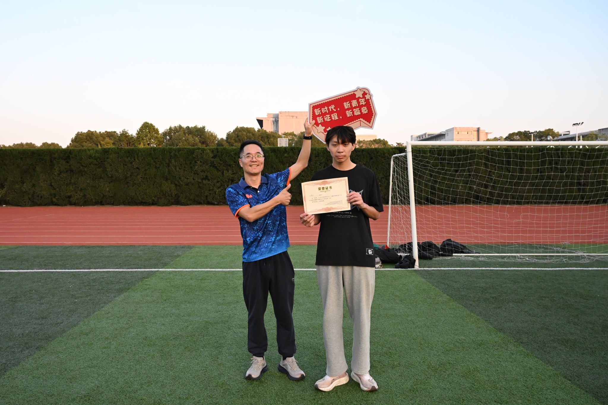 仪式尾声,顾林刚为率先完成跑步任务的陈豪杰同学颁发纪念奖励。现场掌声热烈,将活动推向又一个高潮。