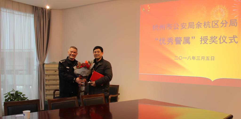 周智敏老师在学校是青年骨干教师,工作任务繁重,但是作为警察家属,他却很好地平衡了工作与家庭的关系,在做好本职工作的同时,多年来一肩担起照顾家庭的责任,默默地支持妻子陈雪芬的工作,让妻子毫无后顾之忧地为社会做贡献。为此余杭区公安分局郑升一行专程来到友嘉机电学院,对优秀警察家属周智敏老师进行表彰,并进行了“优秀警属”的现场授奖仪式。