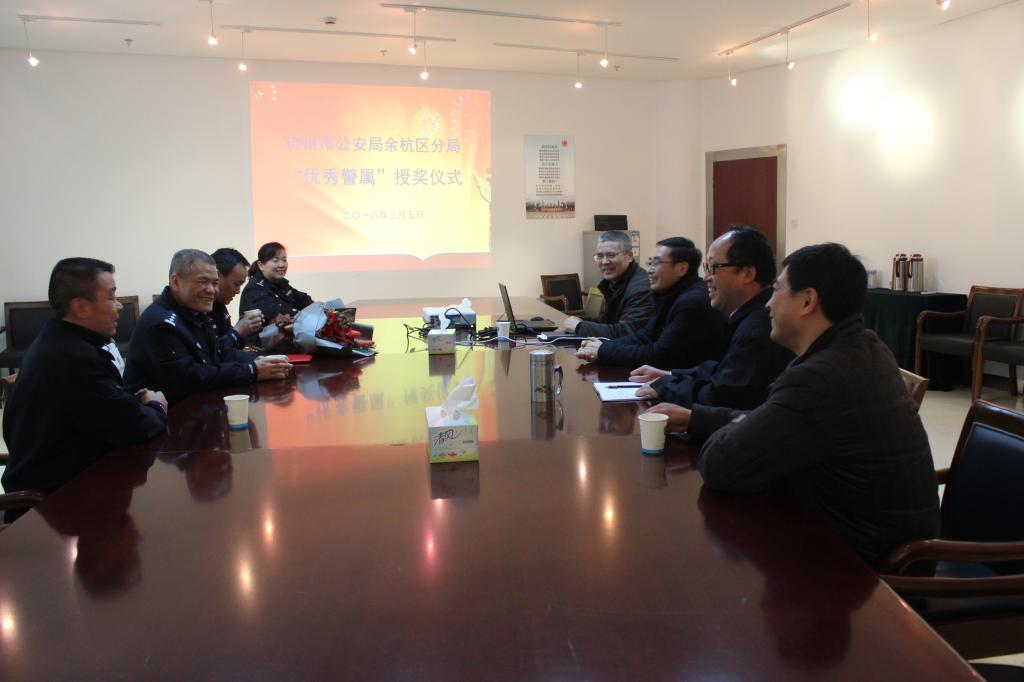 3月5日下午,杭州市公安局余杭区分局党委副书记郑升一行4人专程来友嘉机电学院对警察家属周智敏老师进行表彰授奖,友嘉机电学院院长裘旭东、党总支副书记周佳良、数控专业负责人吴晓苏等进行了接待。