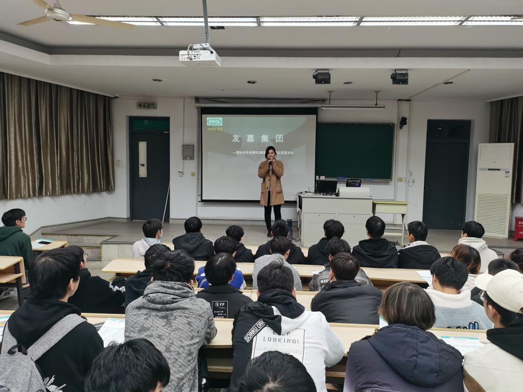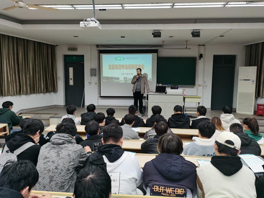 11月24日下午13:30,友嘉智能制造学院在五号教学楼5101教室为2022届毕业生举办了一场校园宣讲会,宣讲单位是友嘉集团,由人力资源部谢经理、俞主任主讲,吸引了200多名学生前来参加,宣讲会由副院长韩天龙主持。