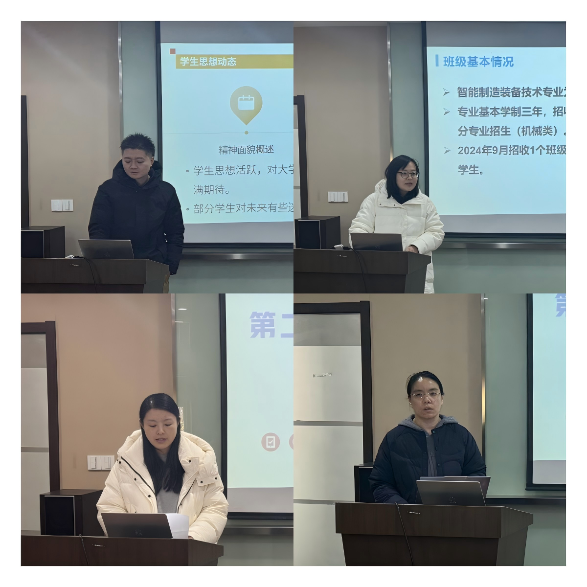 随后,2024 级班主任围绕工作职责,对班级基本情况、管理特色、活动组织、班风学风建设、特殊学生帮扶及成果等方面进行汇报。每位班主任都精心准备,展示出各自独特的管理方法与成果,现场气氛热烈。经过激烈角逐,最终数控2461班主任袁稳沉和智能制造2421班主任王先梦凭借出色表现,将代表学院参加学校决赛。