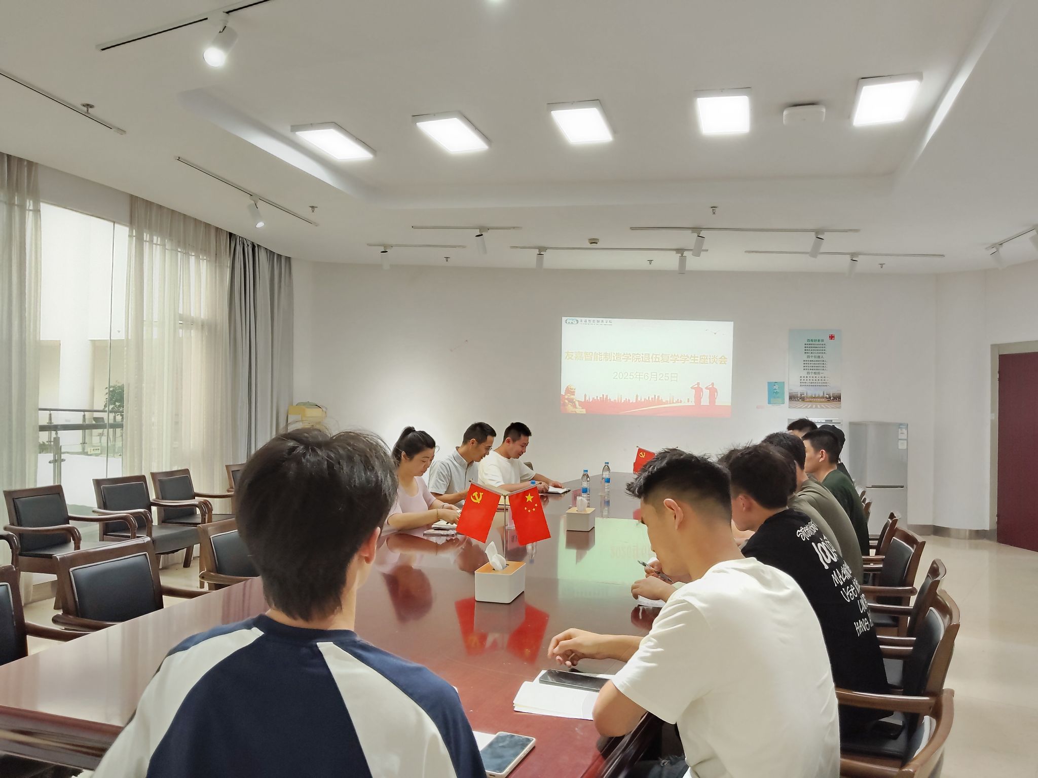 为深入了解我院退役大学生的学习生活情况,倾听大家在部队的成长故事与复学后的需求,进一步做好退役学生教育管理与服务工作,友嘉智能制造学院于6月25日下午在E310会议室召开退役大学生座谈会,友嘉智能制造学院党总支副书记顾林刚、学工办主任魏笑筠、辅导员周小龙和大一大二退役复学学生代表参加了此次会议。