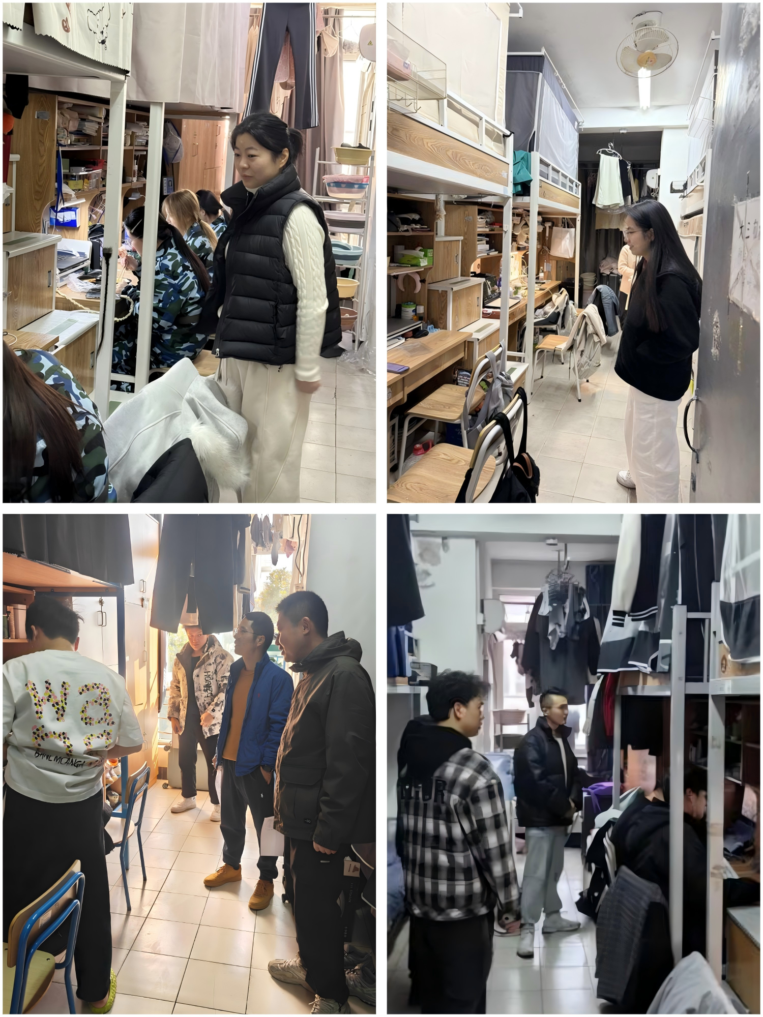 走访过程中,老师们重点围绕违规电器使用、宿舍内吸烟现象等消防安全隐患展开细致排查。针对发现的问题,现场提出整改意见,开展安全教育,并反复叮嘱同学们离寝前务必做到断水断电、清理垃圾、整理内务,确保宿舍环境安全整洁。走访期间,老师们也与同学们亲切交流,关心询问期末复习、寒假安排及生活需求,提醒大家增强安全意识,合理安排假期生活。