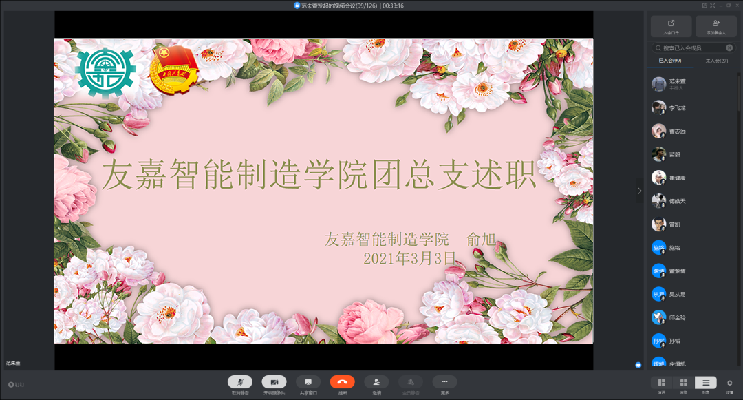 为全面贯彻党中央对共青团和青少年工作的各项要求,提高工作部署的落实成效,按照共青团中央新时代团的组织力提升三年计划(2019—2022)相关文件要求,友嘉智能制造学院团总支于2021年3月3日组织开展了2020年团总支书记述职汇报工作,因疫情防控需要,此次会议在线上开展,团总支学生干部代表、青年团员代表、学生党员代表参加,同时,此次工作报告还将在分院官方微信上同步推送。