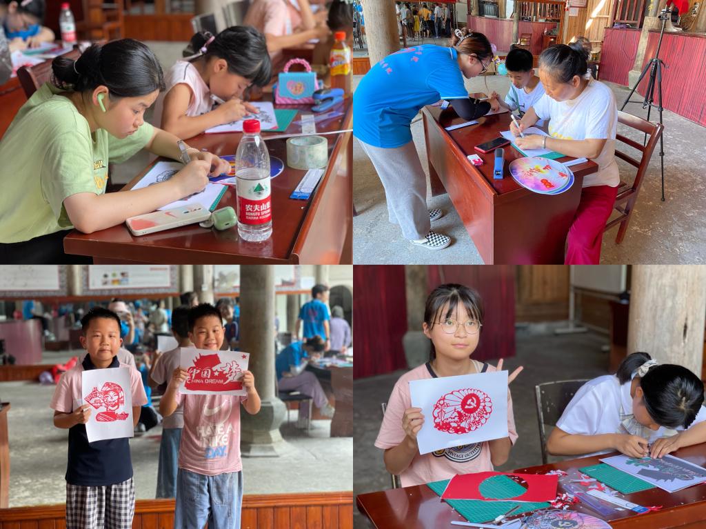 7月8日上午8点,我们开展了“刻红纸献党”活动,村民如约而至,老人带上小孩纷纷进入文化礼堂,范朱萱同学向参与者解说刻纸的由来和历史。拿到材料后,在范朱萱同学的仔细示范教导下,村民纷纷低头开始研究刻纸,思考应该从哪一步开始,范朱萱同学便一步一步进行讲解,参与者的问题都在范朱萱同学的一一教导下得以解决。制作过程中,吸引到许多村民围观,好奇这是一个怎样的活动,时不时还上前指点。炎炎夏日下伴随蝉鸣,天气虽闷热,但静下心来刻红纸得到的是大自然馈赠的清风徐徐,甚是慰抚心灵。小队成员手把手教小朋友刻红纸,体验到非遗传统文化的魅力,还赠送扇子给老人陪他们聊天。参与者们手持刻刀刻出以红船精神、万里长征、祝福祖国为主题的系列作品,在活动中感悟红色历史,弘扬红色精神,传承红色基因,在创作刻纸作品的同时把党史故事刻进参与者的心里,让党史学习教育变得更生动鲜活,幅幅作品凝聚着对祖国、对党的深深爱意与祝福,由衷的爱国爱党之情溢于纸上。