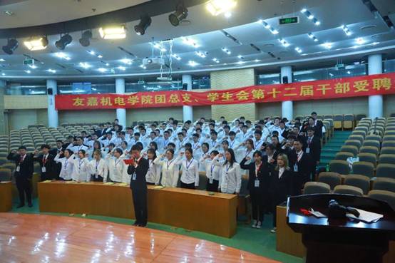 11月1号下午三点半,友嘉团总支、学生会在行政楼二楼报告厅举办了第十二届干部干事受聘大会,出席本次大会的有团总支副书记楼黎瑾老师、上届主席和上届各部长,以及本届全体干部干事。