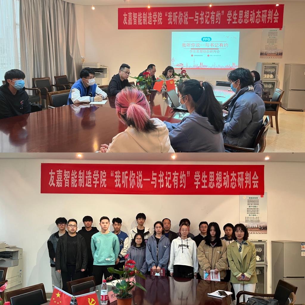 为全面了解和掌握学生思想动态,进一步加强学院意识形态工作。3月10日中午,友嘉智能制造学院在圆盘308会议室召开第十四期“我听你说—与书记有约”学生思想动态研判会,参加本次会议的有友嘉智能制造学院党总支书记付文军,团总支副书记俞旭,公寓专项辅导员李海波以及学生代表。
