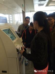 【护士热情的向志愿者们介绍自助挂号机的使用方法,志愿者们同样投以百分百的专注】