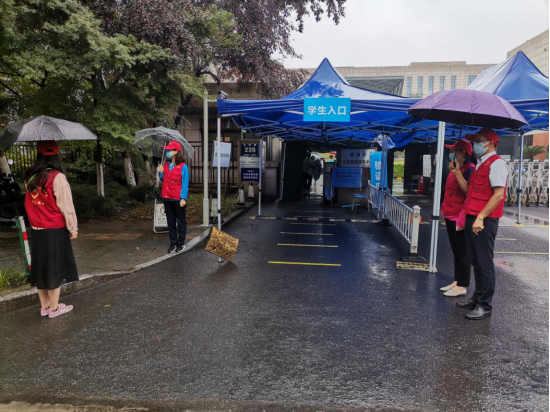 为保障学生在进出校园门岗时,间隔一米,有序排队,进行刷卡测温。第五党支部党员教师在学校东大门分时间段进行轮班值守。值守的主要内容是提醒同学们“排成纵队、间隔一米、戴好口罩、持通行证”有序进校,并处理学生突发情况。学生返校复学以来,天气或夏日炎炎、或雷雨阵阵,但是当听到同学们亲切的“老师早上好”,“老师中午好”,看到他们自觉排队,健康自信的步入校园的时候,志愿者们感到无比自豪。