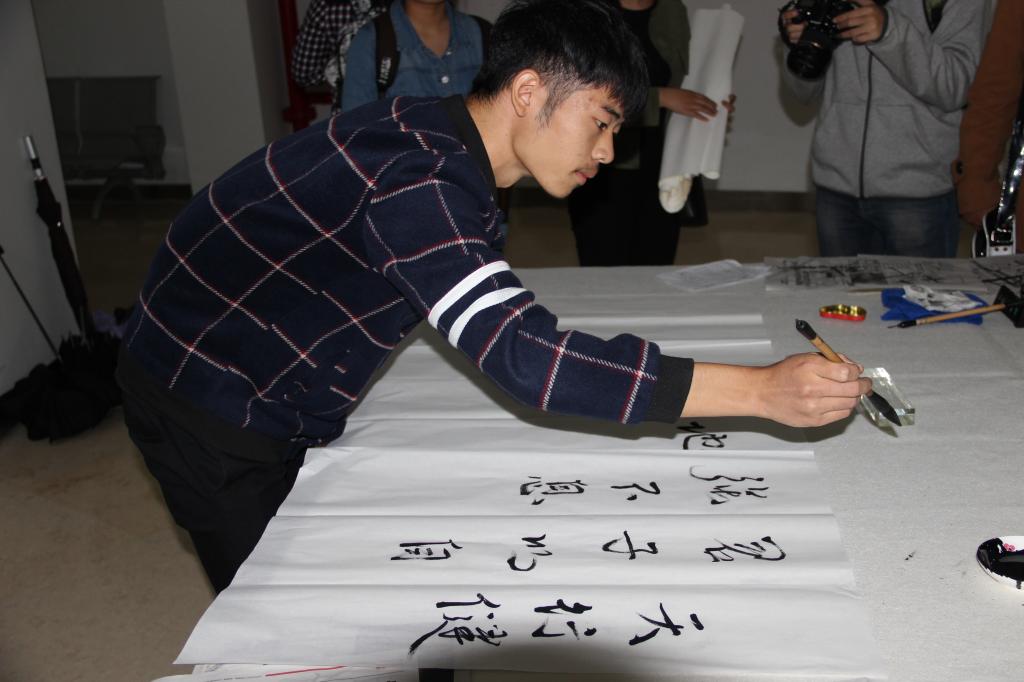 大赛伊始,主持人先介绍了本次比赛的具体要求,之后宣布大赛正式开始。六十余名参赛选手来到比赛场地,兴致高涨,面朝宣纸,手持毛笔,蘸墨,或是临摹,或是自我创作。有的同学一笔一划,写得很有耐心,专注的表情让人不忍打扰;有的同学的作品一气呵成,苍劲有力的字体给人以荡气回肠之感。