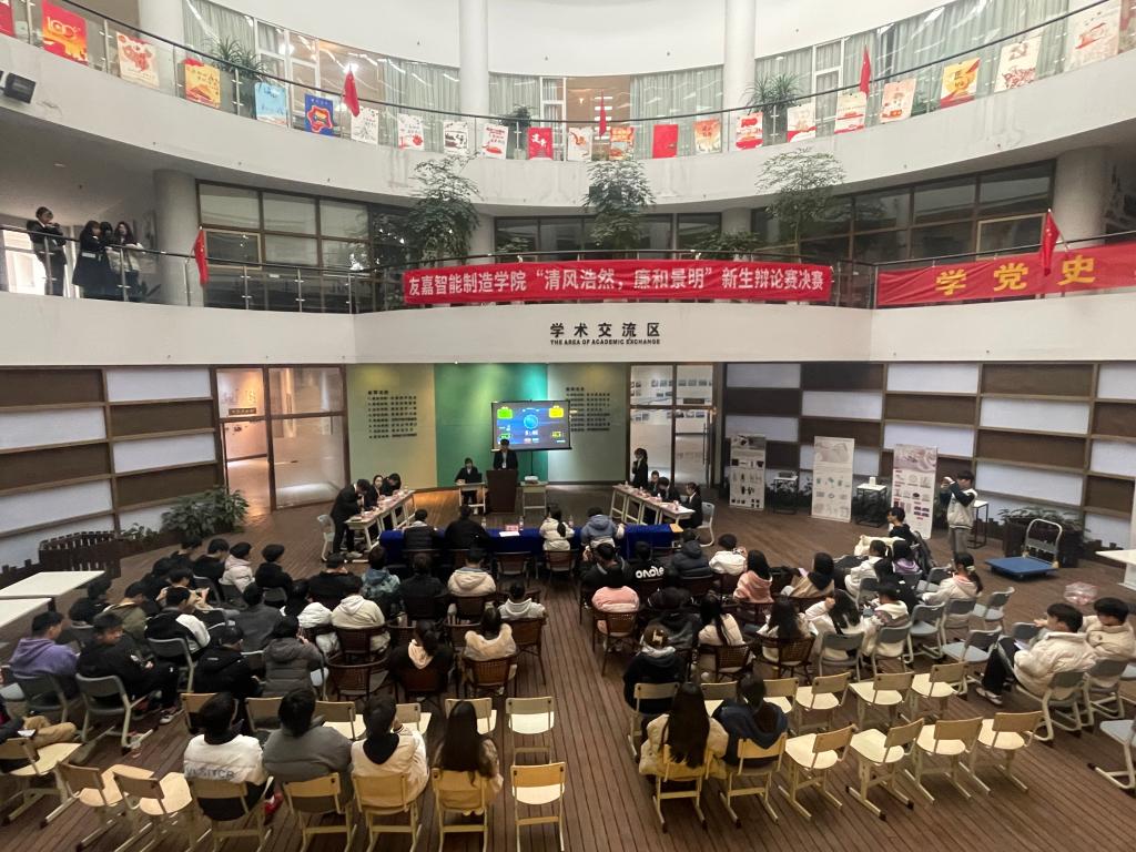 12月8日下午,友嘉智能制造学院开展 “清风浩然,廉和景明”新生辩论赛决赛在友嘉学术交流区隆重举行,此次辩论赛吸引了同学们广泛的关注。经过6场激烈的比赛,智控2111代表队和工设2111代表队两支队伍成功入围决赛,友嘉智能制造学院团总支副书记俞旭、2021级辅导员刘悦应邀出席,校辩论队队员欧家豪、陈逸展、李明轩担当评委。