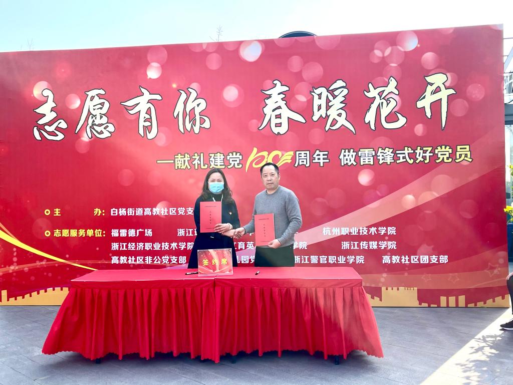 3月25日,白杨街道高教社区在福雷德广场举办了“志愿有你,春暖花开”活动,在活动现场,友嘉智能制造学院与高教社区进行了党团共建协议签订。出席本次签约仪式的有高教社区党支部书记高利萍、友嘉智能制造学院党总支书记付文军、友嘉智能制造学院组织员李雯、友嘉智能制造学院团总支副书记俞旭以及其他兄弟院校团总支负责人。此次党团签约共建,为加强青年思想引领,常态化开展公益志愿服务提供了良好的契机,并为社区、学校进一步加强联系与合作提供了广阔的空间与舞台。