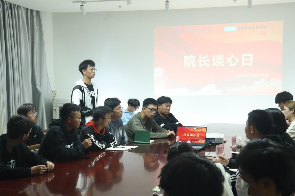 二十大即将到来之际,为及时了解大一新生思想动态,进一步加强学院的意识形态和安全稳定工作,10月12日下午,分院团总支于圆盘308开展第四期友嘉智能制造学院“院长谈心日”暨思想动态研判会议。友嘉智能制造学院院长裘旭东、学工办主任魏笑筠、团总支负责人刘悦、大一年级辅导员周小龙以及2022级新生代表三十余人参与了本次会议。