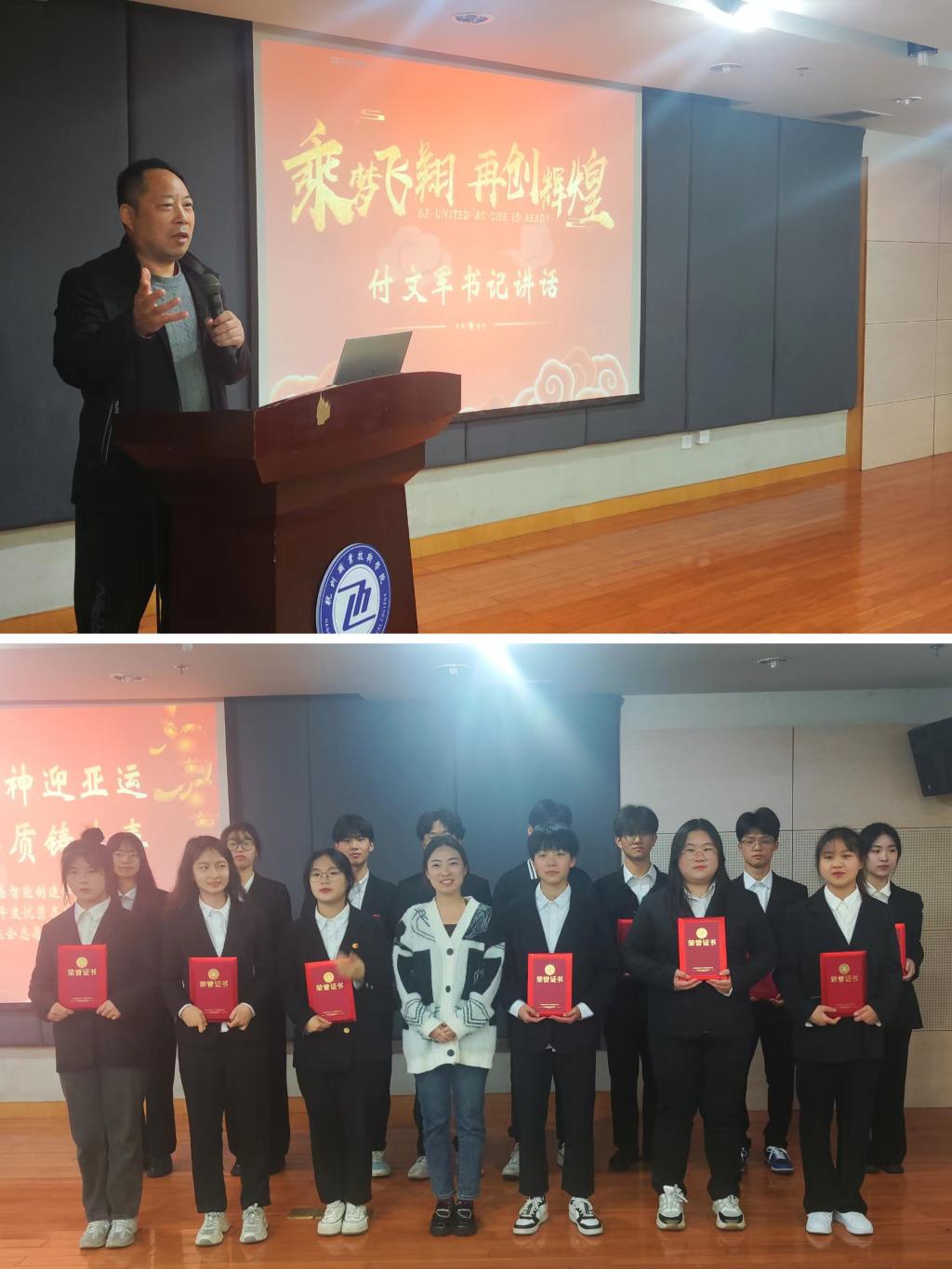 为树立优秀典型,发扬雷锋志愿精神,助力杭州亚运会,友嘉智能制造学院团总支于3月29日下午两点,在行政楼117报告厅举办2022年度优秀志愿者表彰大会暨亚运志愿者动员大会。出席人员有友嘉智能制造学院党总支书记付文军、团总支负责人刘悦、受表彰的先进集体和个人代表以及全体亚运会预录用志愿者。团总支学生副书记王杰主持。