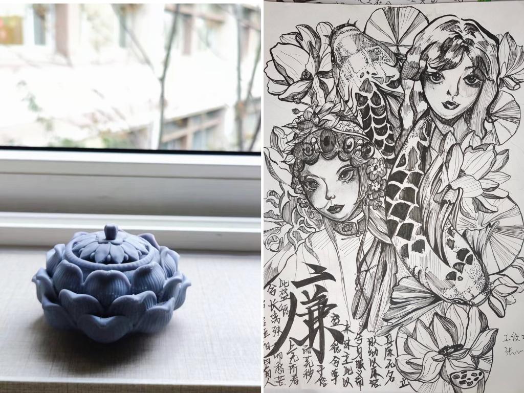 来自工设2211班级张心悦同学的作品《廉与莲》拔类出群,用黑色签字笔勾画出两位来自不同时代的少女,两条鲤鱼穿梭于莲花丛中,将少女环绕,清水出芙蓉,天然去雕饰。一抹莲香,意蕴悠长,正如两位少女在廉洁的氛围中成长。