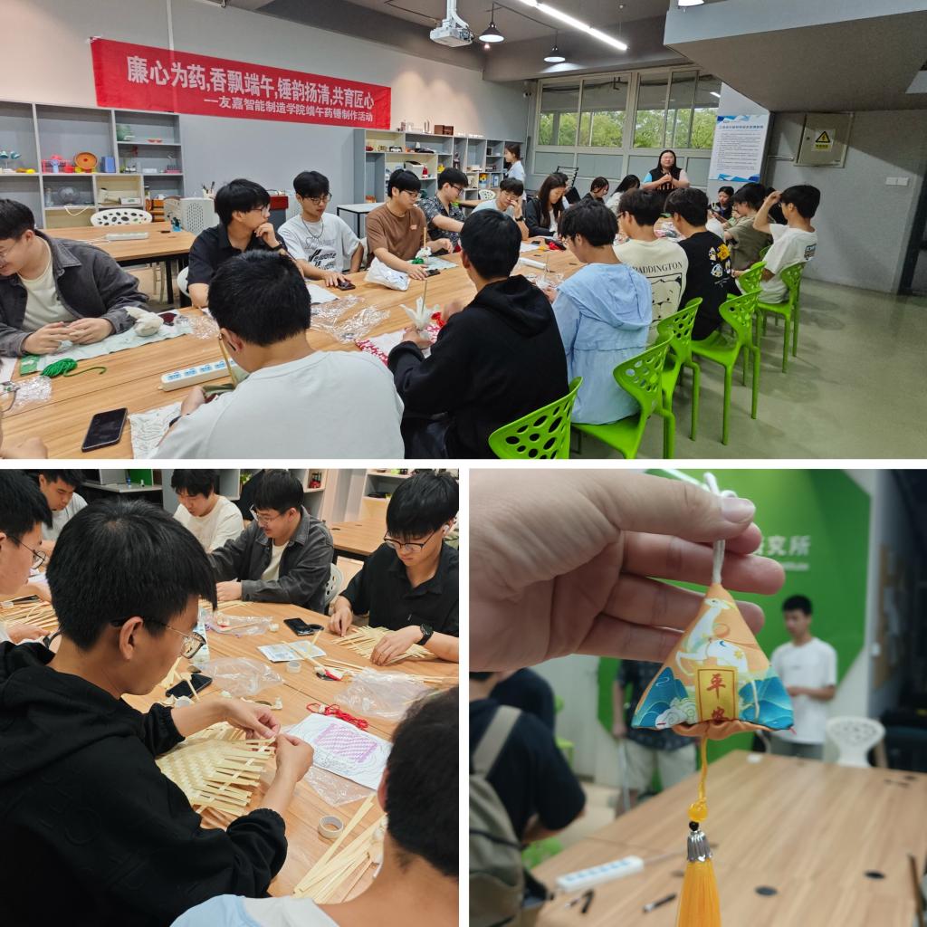 6月5日,端午佳节到来之际,友嘉智能制造学院团总支学生会、自管会与传统文化协会携手,精心策划并举办了“廉心为药,香飘端午,锤韵扬清,共育匠心”端午特色活动,旨在通过亲手制作药锤、蒲扇和香囊等传统工艺品,弘扬风清气正的文化精神,在体验传统文化魅力的同时,感受清廉品质的熏陶。