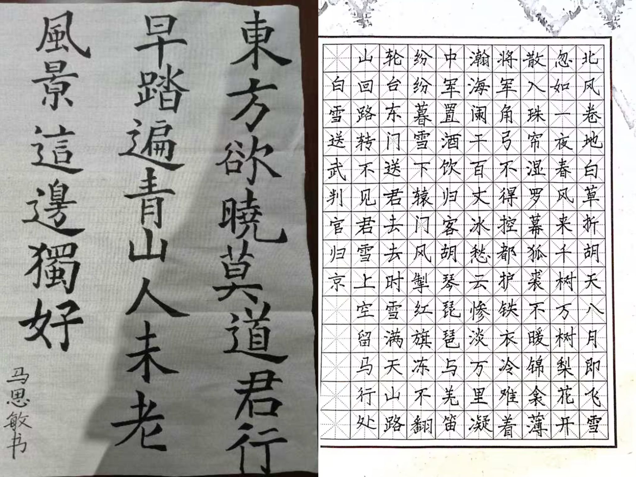 比赛期间,选手们挥毫泼墨,各展风采。马思敏以《满江红·岳飞》为题材,字体流畅有力,背景梅花图案雅致;姜慎怡则选择了李白的《行路难》,字体工整有力,与背景山水画相得益彰;檀丽娟、王鑫等同学的作品同样展现出深厚的书法功底。