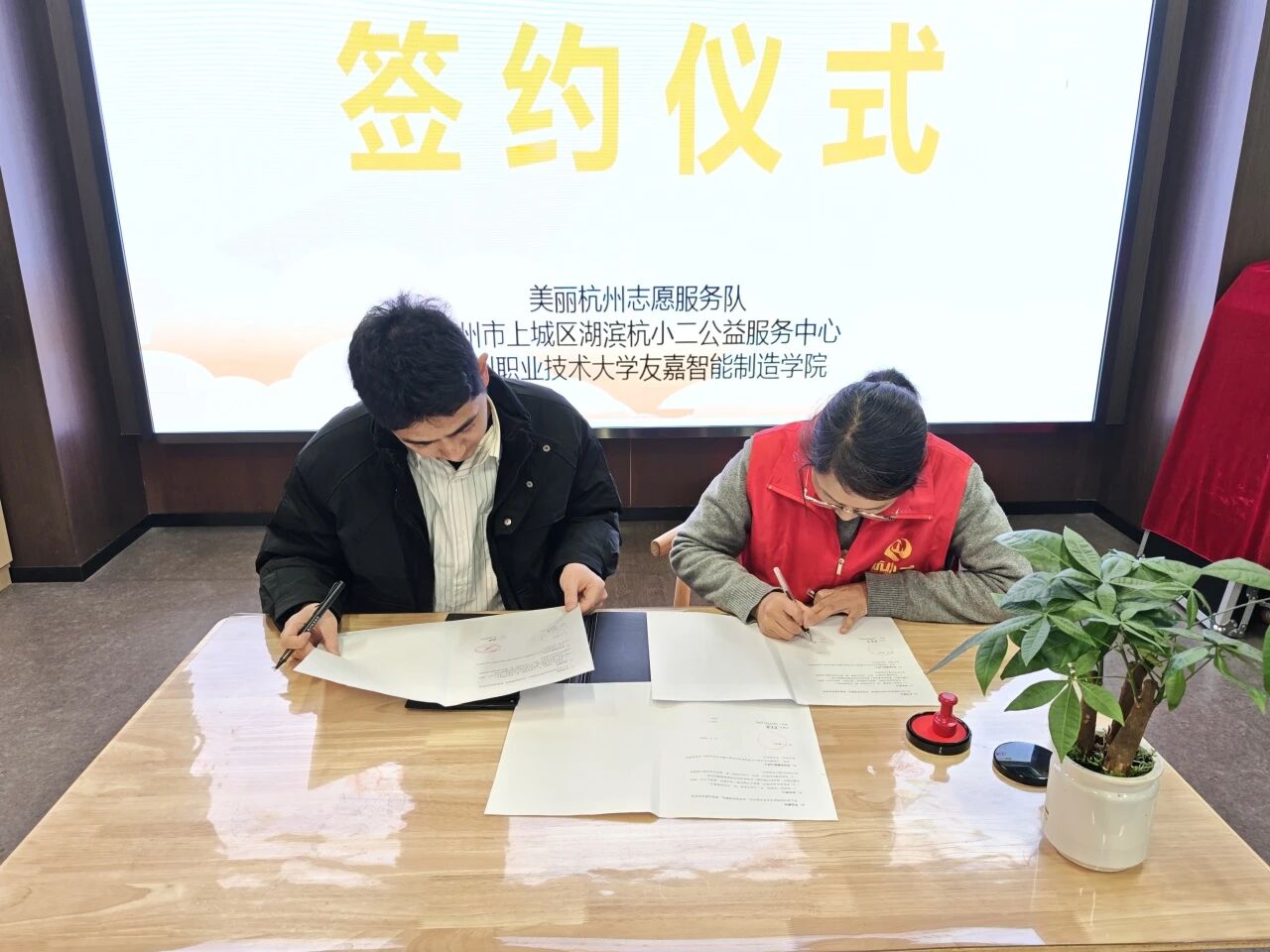 智造青春聚力行,校社携手志愿兴。近日,友嘉智能制造学院与杭小二公益志愿服务中心正式签约合作协议,标志着校社合作、共筑专业化特色志愿的新基地正式成立。学院团总支负责人吴翌晨与美丽杭州志愿服务队、杭小二公益服务中心代表梅瑛共同出席本次签约仪式。